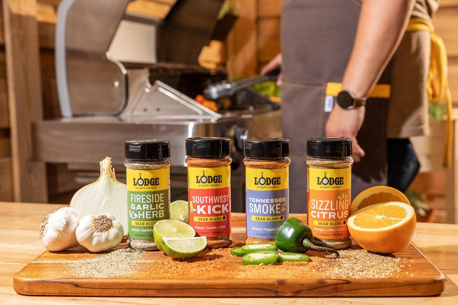 A match made in heaven. Pair your favorite 10.5 Inch Cast Iron Pre-Seasoned Grill Pan with our Lodge new Sear Blends, perfect for high heat cooking! This bundle includes 1 grill pan and a 4 pack of sear blends. Each blend contains 5.8 oz ounces of seasoning.