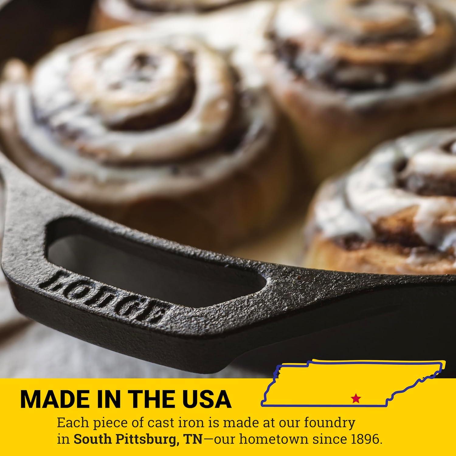 What makes this the classic American skillet? Made in the USA for more than 125 years, it's been a staple in kitchens around the world. Crafted in America with iron and oil, its naturally seasoned cooking surface is ready to help you turn your meals into delicious, shareable moments. Cast to last! Seasoned and ready to use. Hailed as an essential kitchen tool by the country's leading chefs and publications, the Lodge 10.25 Inch Cast Iron Skillet has been crafted to cook memorable meals for generations. It offers an abundance of possibilities. Care instructions for cast iron: 1. Wash with warm water. Add a mild soap, if desired. 2. Dry thoroughly with a lint-free cloth or paper towel. 3. Oil the surface of the pan with a very light layer of cooking oil while warm. Hang or store the cookware in a dry place.