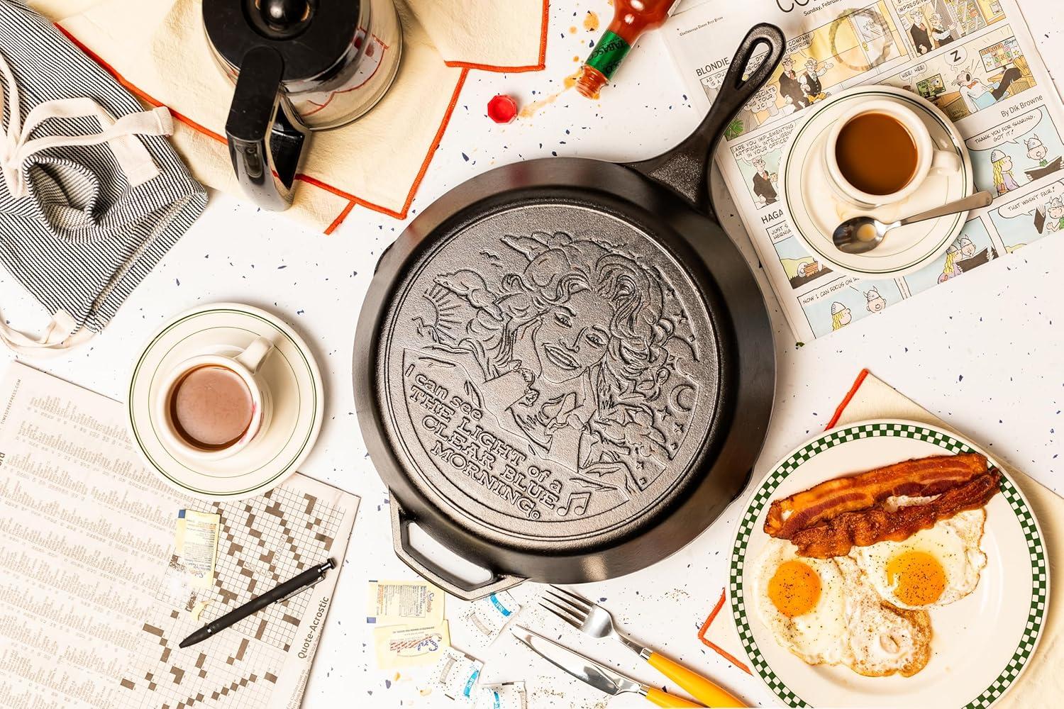 Lodge 13.25 Inch Dolly Parton Pre-Seasoned Cast Iron Stamped Skillet – Signature Teardrop Handle – Use in the Oven, on the Stove, on the Grill, or Over a Campfire – Clear Blue Morning