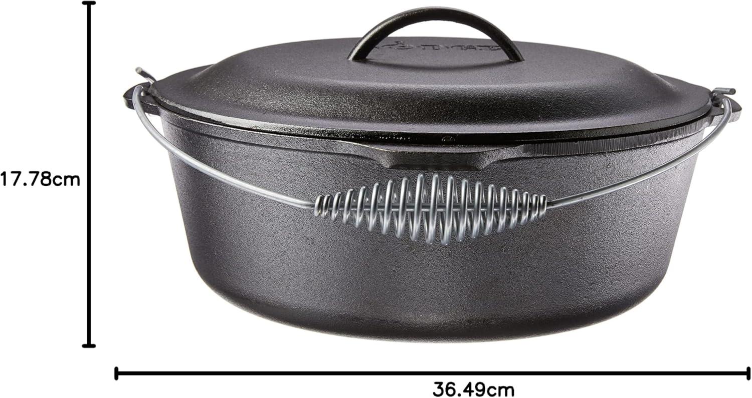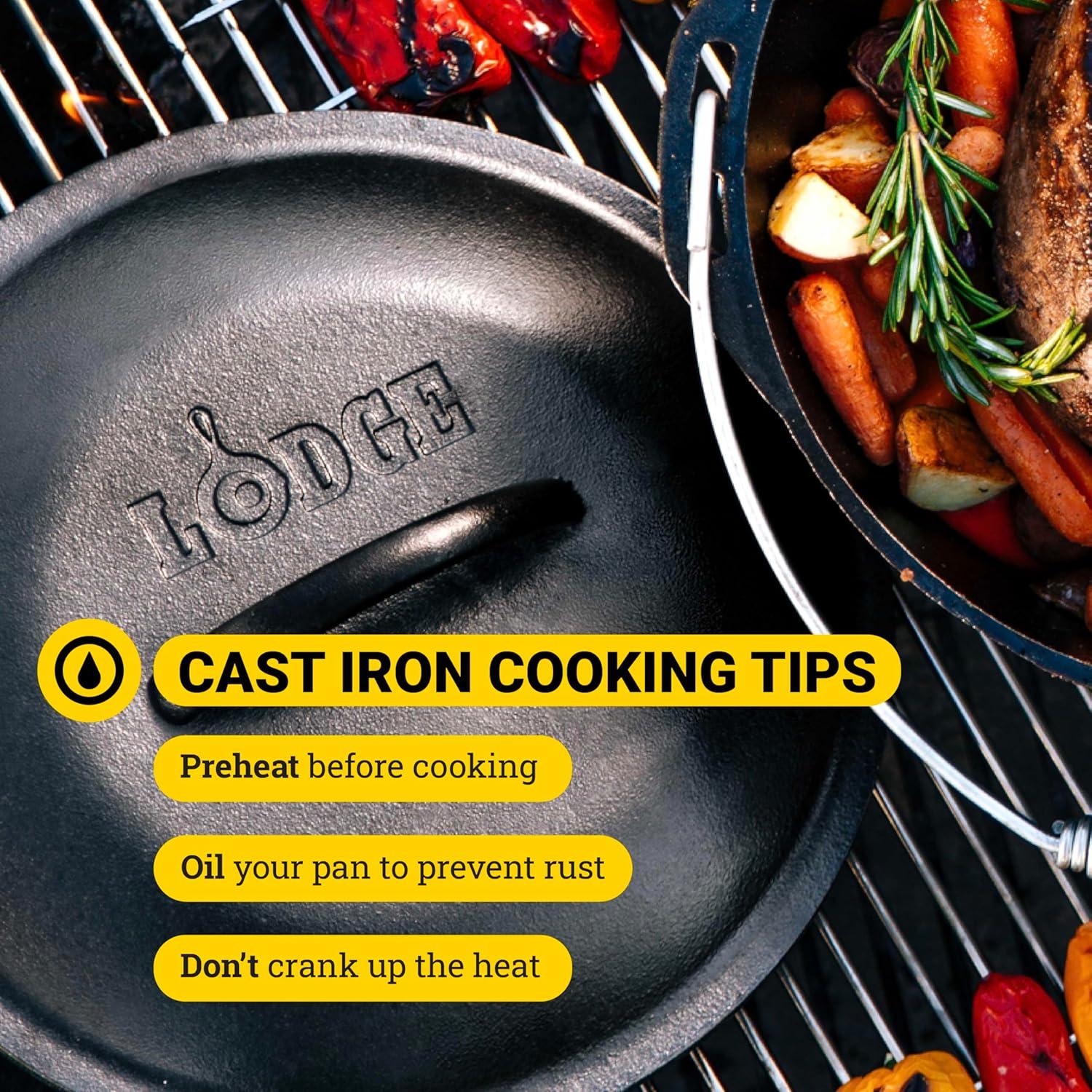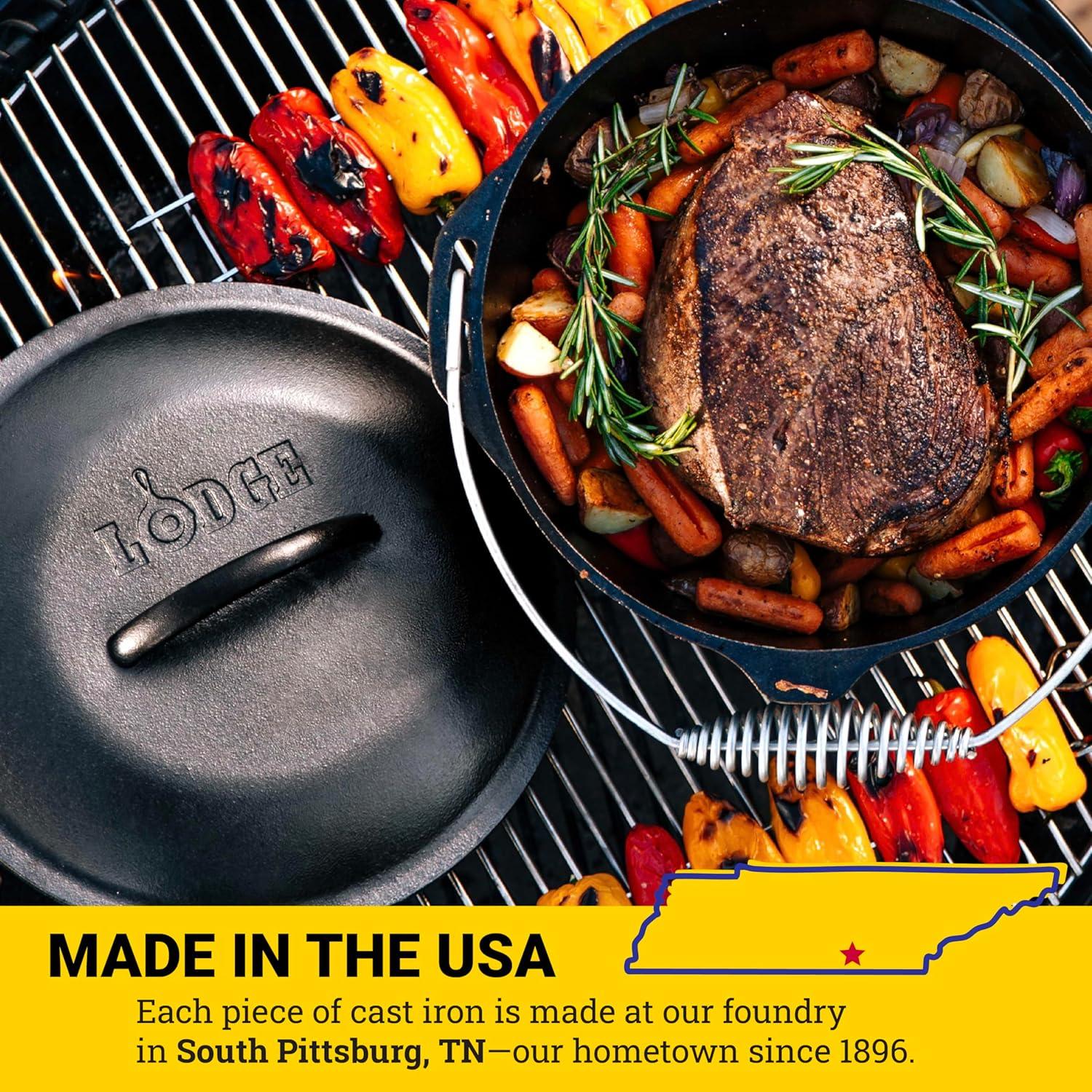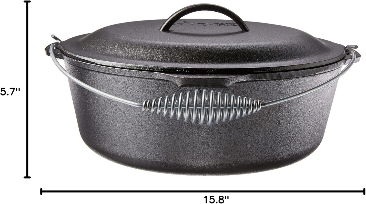 Lodge Logic Dutch Oven with Spiral Loop Handle Even, Gentle HeatingThe Lodge Traditional Dutch Oven with Wire Bail handle has been popular for over a century, and is perfect for camp and hearth cooking. The Lodge Cast Iron Dutch Oven is a multi-functional cookware that works wonders with slow-cooking recipes. It comes with a tight-fitting lid that helps lock in nutrition and flavor. This pre-seasoned Dutch Oven works like a charm right out of the box. Made of cast iron, this Dutch Oven evenly distributes heat from the bottom through the sidewalls. Also, it retains heat better so your delicious meal remains warm for a long time. Sporting a stylish black color, the cast iron Dutch Oven looks good in most kitchens and it doubles up as an excellent source of nutritional iron. It features loop handles for convenient handling and the oven is easy to clean and maintain. A simple Cast-Iron Dutch Oven, like the one your grandmother used, still ranks as one of the best cooking utensils ever made. It gives you a nearly non-stick surface, without the possible harmful fumes generated by preheating chemically treated nonstick cookware. Many of the pieces of cast iron cookware made in the Lodge Foundry over a century ago remain in use today. Cast-Iron LidFeatures: Made of cast ironPre-seasoned and ready-to-useMulti-functional cookwareVirtual Non-stick surfaceWorks with induction stove topsBrutally tough for decades of cookingWire bale handleEasy to clean: hand wash, dry, rub with cooking oil Detailed Highlights: Multi-Functional Cookware The right tool for searing, sauteing, simmering, braising, baking, roasting, and frying. Made of Cast-Iron Cast-Iron is a form of cookware developed over a millennia ago remains as popular today as when it was used to prepare meals hundreds of years ago. Cast Iron is one of only two metals compatible with induction stovetops. Unparalleled in heat retention and even heating. Can Be Used With A Variety of Heat Sources At home in the oven, on the stove, on the grill or over the campfire. Skillet may be used on various heat sources including gas, electric, induction and ceramic-glass top stoves and ovens. When using on glass stove tops, be careful not to slide the cookware around as it's possible to scratch the surface. Seasoned cast iron can also be used on the grill or outdoor fire and coals for camp cooking. Begin heating cookware on low and slowly bring heat up to medium or medium/high. Always remove cookware from the stovetop after cooking. Pre-Seasoned Seasoned for a natural, easy-release finish that improves with use. Seasoning is a necessary step in using cast iron cookware. Oil is baked into the pores of the iron at the foundry to prevent rusting and to eventually provide a natural, non-stick cooking surface. Unlike synthetically coated cookware, it is possible to restore the cooking surface of cast iron. Lodge uses a proprietary soy-based vegetable oil to season our cookware. The oil contains no animal fat or peanut oil. The seasoning is functional application and slight inconsistencies may appear in the seasoning finish. The inconsistencies will not affect cooking performance. Easy to Care for Hand wash, dry, rub with cooking oil. It is very important to replenish the seasoning of your cast iron cookware by applying a thin layer of oil after each cleaning. Seasoning is an on-going process. The more you use cast iron, the seasoning is improved. Using Your Lodge Cast Iron Rinse with hot water (do not use soap), and dry thoroughly. Before cooking, apply vegetable oil to the cooking surface of your pan and pre-heat the pan slowly (always start on low heat, increasing the temperature slowly). Once the utensil is properly pre-heated, you are ready to cook. TIP: Avoid cooking very cold food in the pan, as this can promote sticking. PLEASE REMEMBER: Handles will become very hot in the oven, and on the stovetop. Always use an oven mitt to prevent burns when removing pans from oven or stovetop. Care and Cleaning of your Lodge Cast Iron After cooking, clean utensil with a stiff nylon brush and hot water. Using soap is not recommended, and harsh detergents should never be used. (Avoid putting a hot utensil into cold water. Thermal shock can occur causing the metal to warp or crack). If you are having trouble removing stuck-on food, boil some water in your pan for a few minutes to loosen residue, making it easier to remove. Towel dry immediately and apply a light coating of oil to the utensil while it is still warm. TIP: Do not let your cast iron air dry, as this can promote rust. Store in a cool, dry place. If you have a cover, or lid, for your utensil, place a folded paper towel in between lid and utensil allowing air to circulate. This prevents moisture from collecting inside the utensil, which can cause rust. TIP: The oven is a great place to store your cast iron; just remember to remove it before turning on the oven. NEVER wash in dishwasher. If for some reason your utensil develops a metallic smell or taste, or perhaps rust spots (maybe a well-meaning relative washed your utensil in the dishwasher or with soap thinking they were being helpful), never fear. Simply scour off the rust using a very fine grade of sandpaper or steel wool and refer to our section on re-seasoning. Re-Seasoning your Lodge Cast Iron While maintaining the seasoning should keep your Cast Iron in good condition, at some point you may need to repeat the seasoning process. If food sticks to the surface, or you notice a dull, gray color, repeat the seasoning process: Wash the cookware with hot, soapy water and a stiff brush. (It is okay to use soap this time because you are preparing to re-season the cookware). Rinse and dry completely. Apply a thin, even coating of MELTED solid vegetable shortening (or cooking oil of your choice) to the cookware (inside and out). Place aluminum foil on the bottom rack of the oven to catch any dripping. Set oven temperature to 350 � 400 degrees F. Place cookware ups