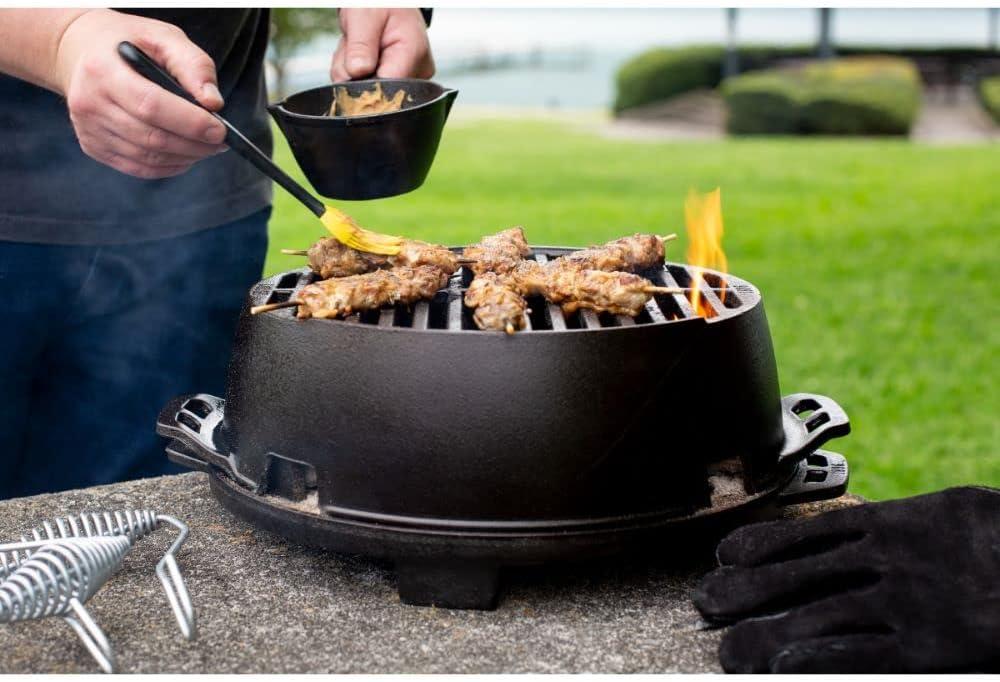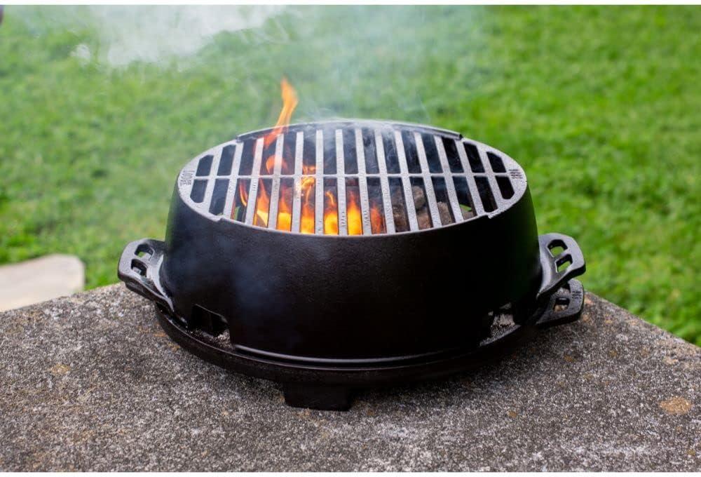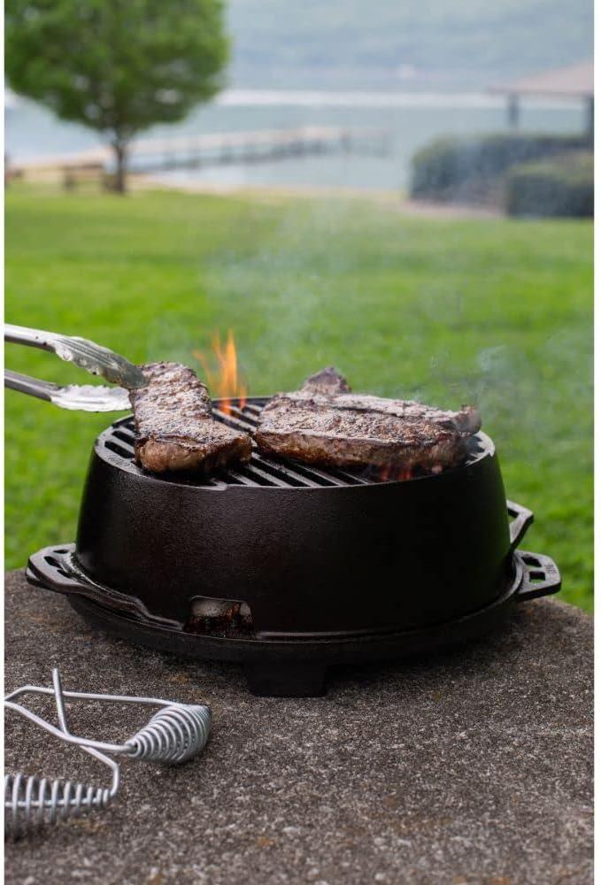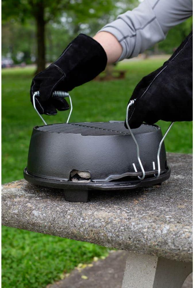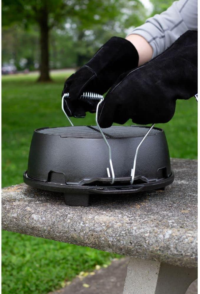 YOUR NEW GO-TO GRILL: The Lodge Kickoff Grill can handle the heat. It is made of two pieces of cast iron that require no assembly; its easy-to-use design allows you to simply twist to adjust the draft as you cook. Plus, this grill comes with a set of Steel Hook & Carry Handles for a secure, safe grip when lifting and moving around the campsite.