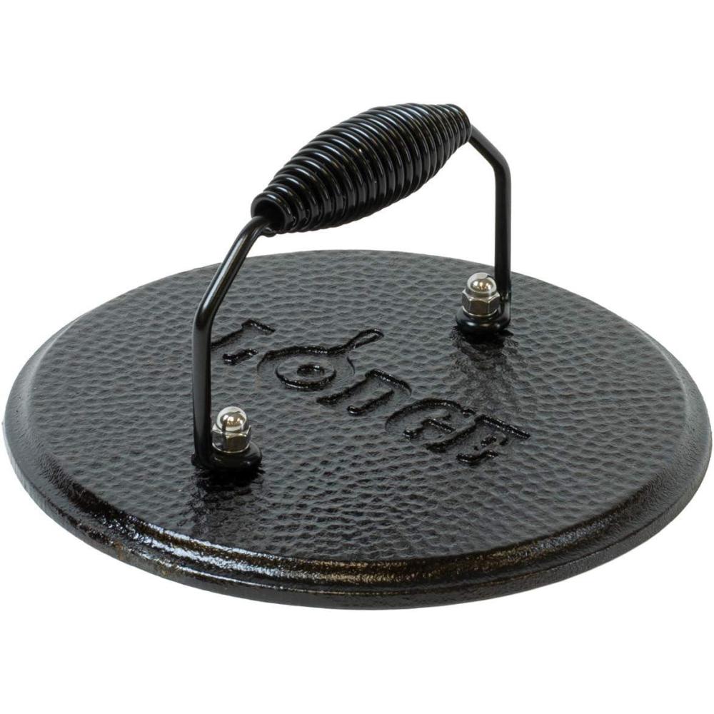 On the stovetop or grill, the Lodge Cast Iron Grill Press keeps bacon from curling and presses out unwanted grease from burgers. When preheated, the press also significantly speeds up cooking time. The heavy-duty cast iron base with a rustic hammered finish provides excellent heat retention for consistent, even cooking, and the spiral handle allows for a safe, comfortable grip. This grill press is safe to use in the oven, on the stove or grill, and over a campfire. The Lodge Cast Iron Grill Press is made for decades of cooking and comes pre-seasoned for an easy-release finish that improves with use. Assembly requires a flathead screwdriver and an adjustable wrench or pliers. Includes one Lodge Cast Iron Grill Press, 6.75 Inch x 4.5 Inch. Made in America. Care instructions for cast iron: 1. Wash with warm water. Add a mild soap, if desired. 2. Dry thoroughly with a lint-free cloth or paper towel. 3. Oil the surface of the pan with a very light layer of cooking oil while warm. Hang or store the cookware in a dry place. ;For the stovetop or the grill, this press pushes out the excess fat in burgers or chicken, eliminates the curl in bacon or ham, and retains the heat in grilled sandwiches. Made of heavy cast iron and weighing about 3 pounds, the grill press uses its heft to do the work. The press measures 6-3/4 by 4-1/2 inches and has a unique hammered finish. A cool-grip spiral handle keeps hands comfortable when working over a hot grill.–Cristina Vaamonde.